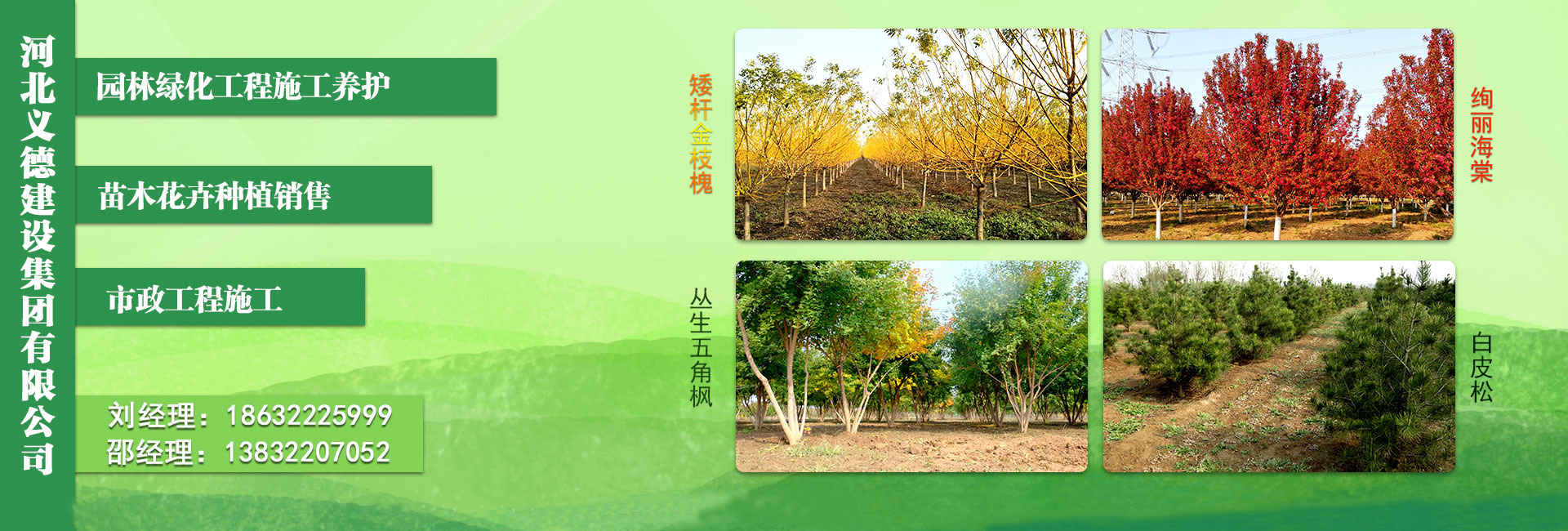 近幾年來我公司被授予2019年-2022年河北省扶貧龍頭企業(yè)、2018年國家林業(yè)標(biāo)準(zhǔn)化示范企業(yè)、2019年度全國苗圃50強(qiáng)、2018-2019年度河北省林業(yè)重點(diǎn)龍頭企業(yè)、2018年保定市精品特色現(xiàn)代農(nóng)業(yè)園區(qū)、2018年度保定林木種苗協(xié)會授予特色苗圃、2018年度北方十佳特色苗圃、2016-2019年河北省建設(shè)工程招標(biāo)投標(biāo)誠實(shí)守信5A級施工企業(yè)等榮譽(yù)稱號,2017年保定市林木種苗龍頭企業(yè)、石家莊市2017年度優(yōu)秀園林企業(yè)。